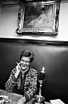 «Når hun dro i gang med røverhistorier, så var festen i gang. Flest historier var det om damer». Her er Kim Friele på kafé i Oslo i november 1970.