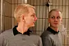 Han står i dusjen. Kameraet har et nærbilde av ansiktet. En vanndråpe renner nedover kinnet. Det ser ut som en tåre.